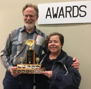 Overall winners Kirk Homis and Virginia Youens smile as Ele hefts massive trophy